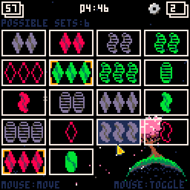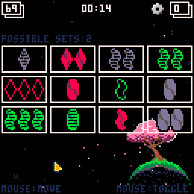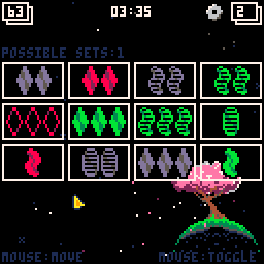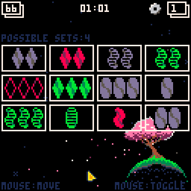 This is our take on the popular card game "Set", which is a puzzle game about making unique combinations of cards. This interpretation is meant to be a relaxing experience, aimed at helping the user hone their skills.